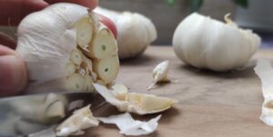 - Zagrej rernu na 180 °C. Odseci vrh svake glavice belog luka da se vide čenovi.