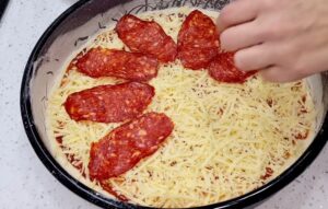 - Rasporedi kulen, kačkavalj i pečurke po celoj površini.